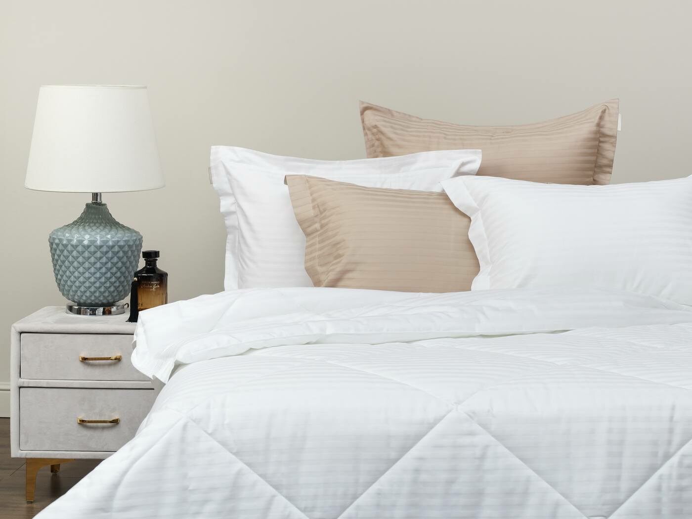 Это постельное белье с одеялом, которое не надо вставлять в пододеяльник. Комплект выполнен из качественной и натуральной хлопковой ткани. Эта ткань сочетает в себе мягкость и прочность, обеспечивая незабываемые ощущения во время сна. Жаккардовое плетение создает однотонный рисунок с элегантными чередующимися глянцевыми и матовыми полосками шириной 1 см, что привнесет вашему интерьеру изысканный вид. Такое плетение нитей придает долговечности ткани и потому используется в хороших отелях.