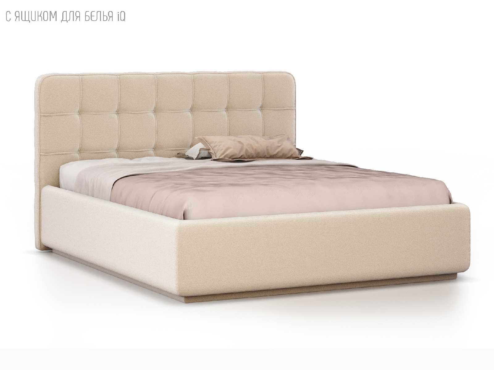 Кровать укомплектована IQ с подъемным механизмом и ящиком для белья без дна (дополнительная платная опция - дно к ящику IQ из HDF (ХДФ). Каркас кровати на цоколе, декоративный чехол на цоколе съёмный. Глубина ящика для белья - 30 см, без ограничения нагрузки на ящик.
