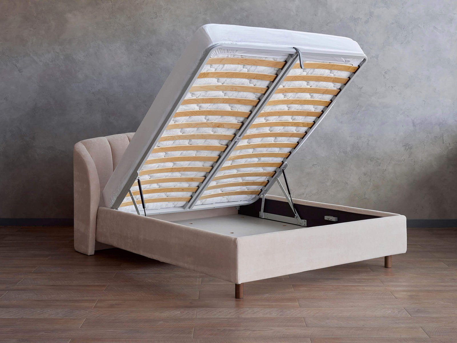 Кровать комплектуется металлическим основанием и подъемным механизмом со вместительным бельевым ящиком. Дно бельевого ящика легко сдвигается для обеспечения уборки под кроватью.