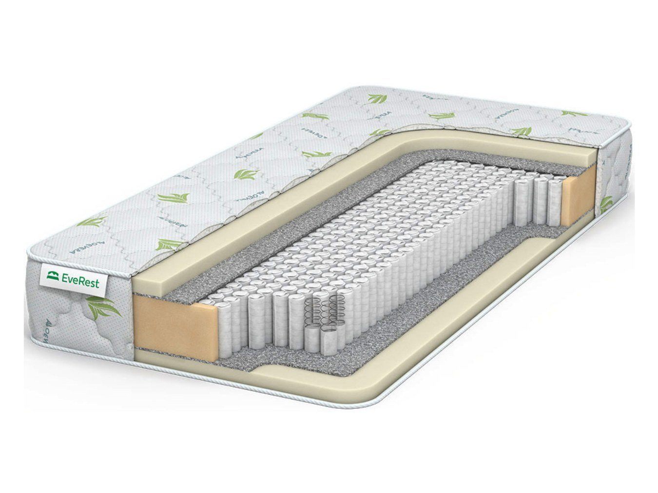 Матрас оббит трикотажным чехлом, который получил специальную фирменную пропитку Aloe Vera. Состав препятствует размножению микроорганизмов, поэтому чехол на долго сохранит свою чистоту и свежесть. Все поверхности простёгиваются на 200 гр наполнителе.