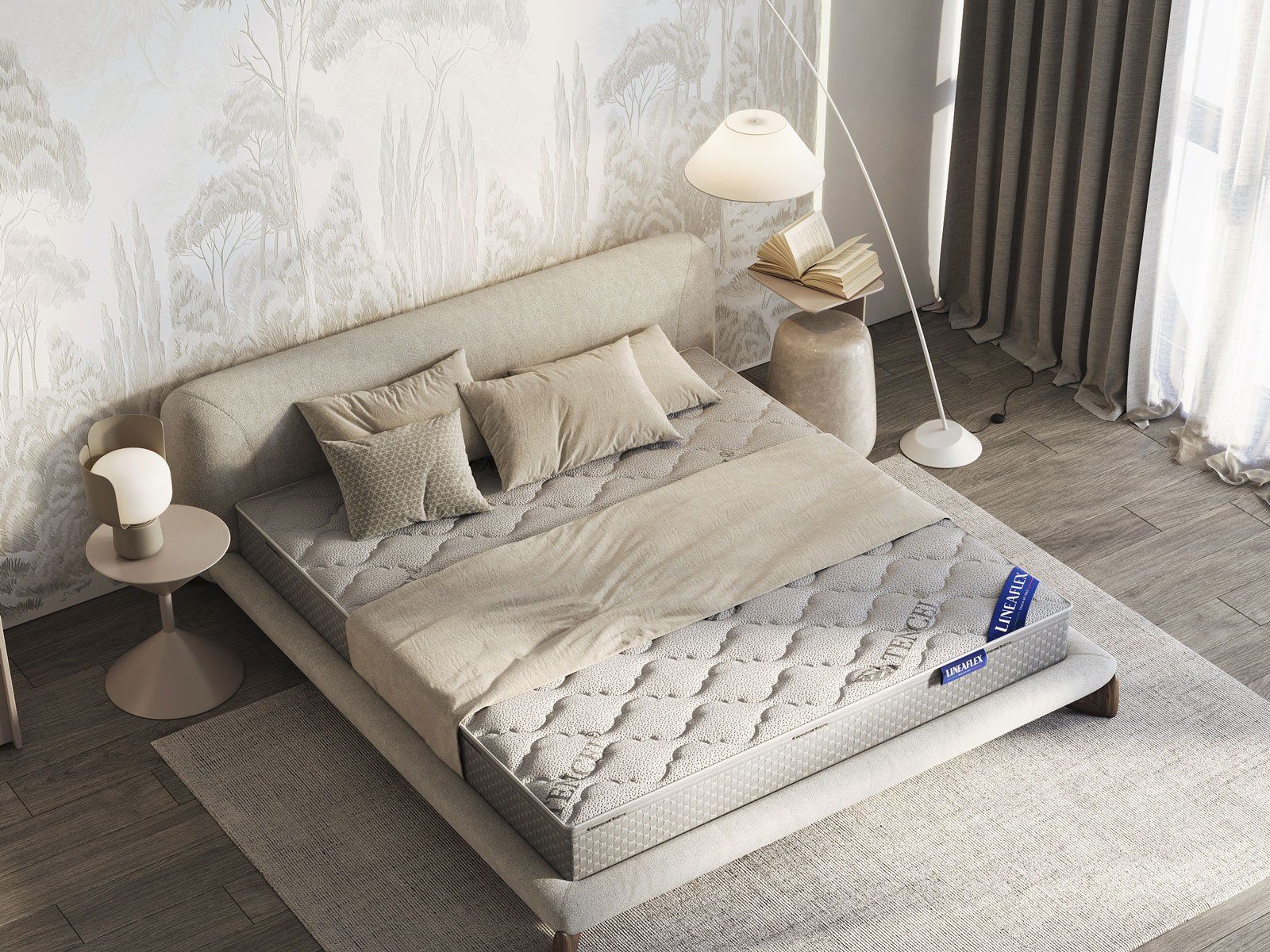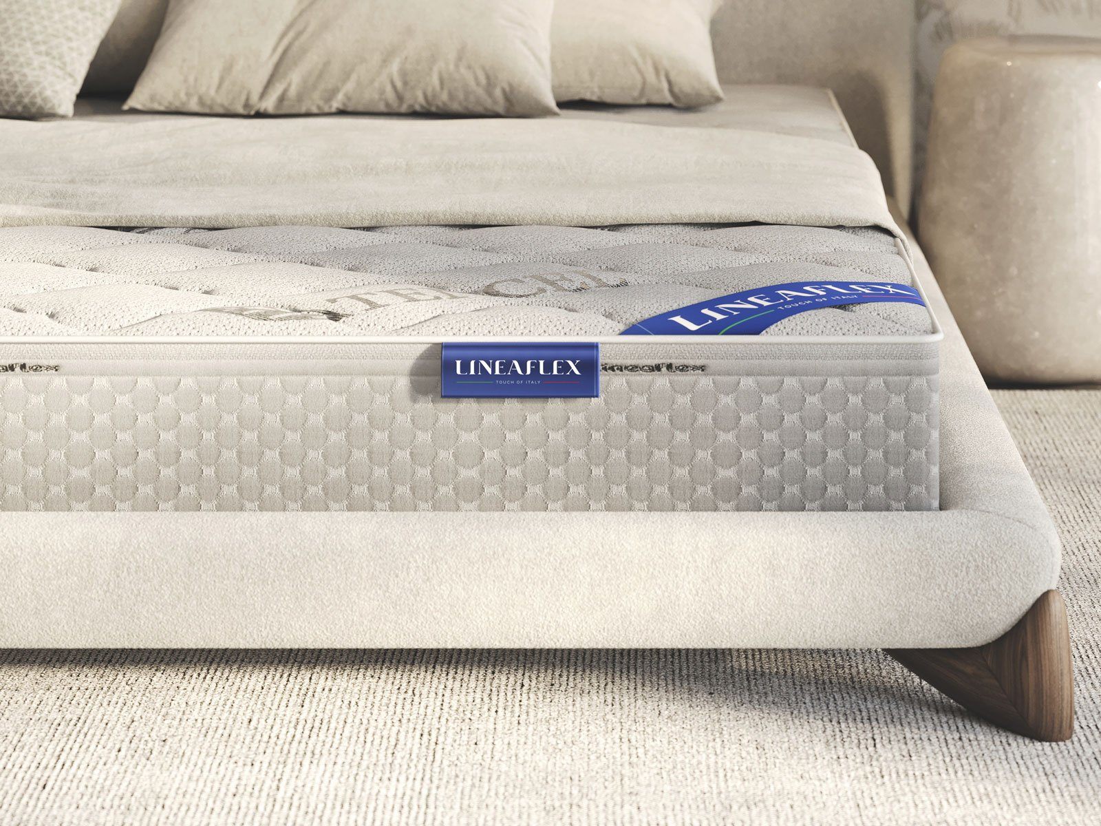 Обивка модели изготавливается из трикотажа, содержащего 50% эвкалиптового волокна. Данный материал гипоаллергенен, гигроскопичен, способен к аэрации и обладает природным антибактериальным эффектом. В качестве наполнителя установлен объёмный холлофайбер. Слои сшиваются объёмной стёжкой и в результате обивка обретает дополнительную мягкость и воздушность.