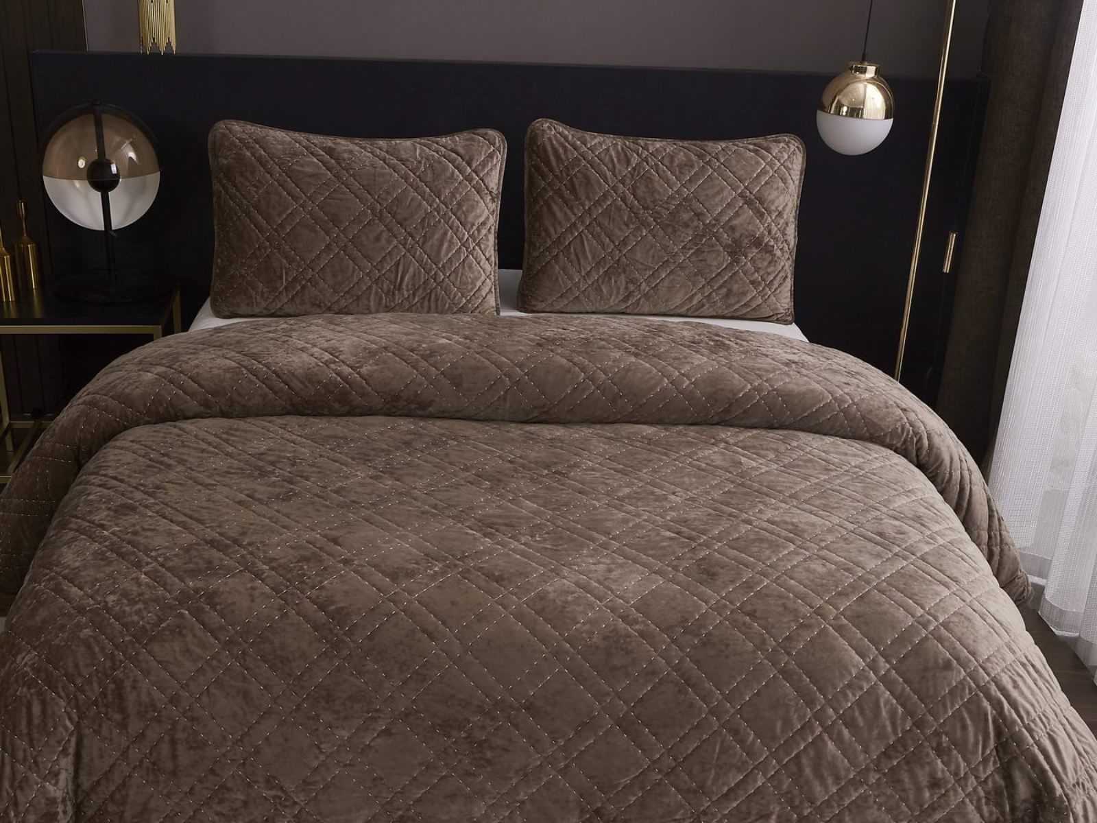 Покрывало Селена выполнено в девяти оттенках: пудра, антрацит, беж, изумруд, капучино, пепел роза, серебро, стоун, терракот. Они подойдут практически для любого интерьера, от классического, до модерна или романтического. Стеганое бархатное покрывало будет необыкновенно смотреться на вашей постели. В комплект входят покрывало и одна либо две наволочки (50х70 см) из аналогичного материала в зависимости от размера.