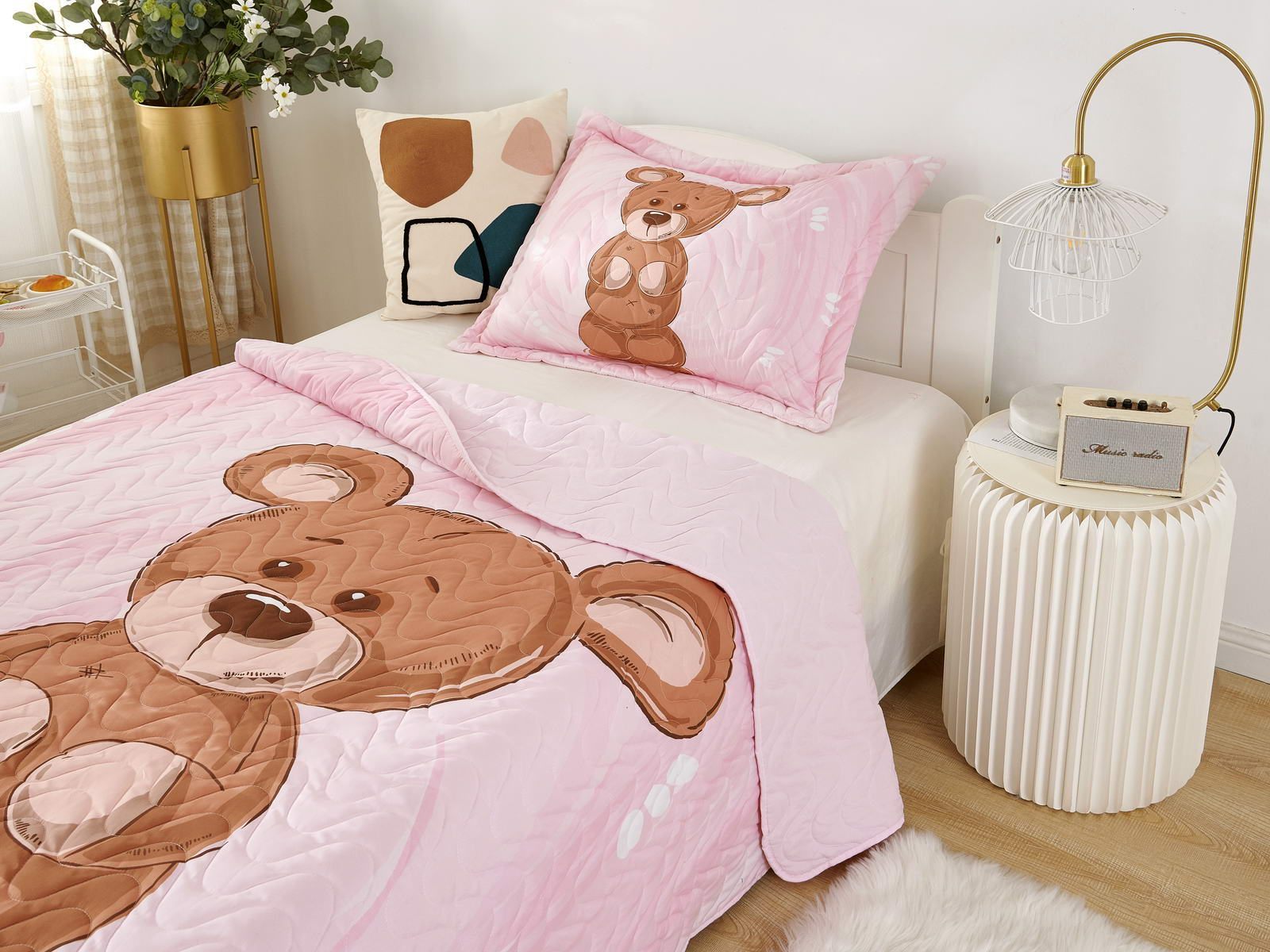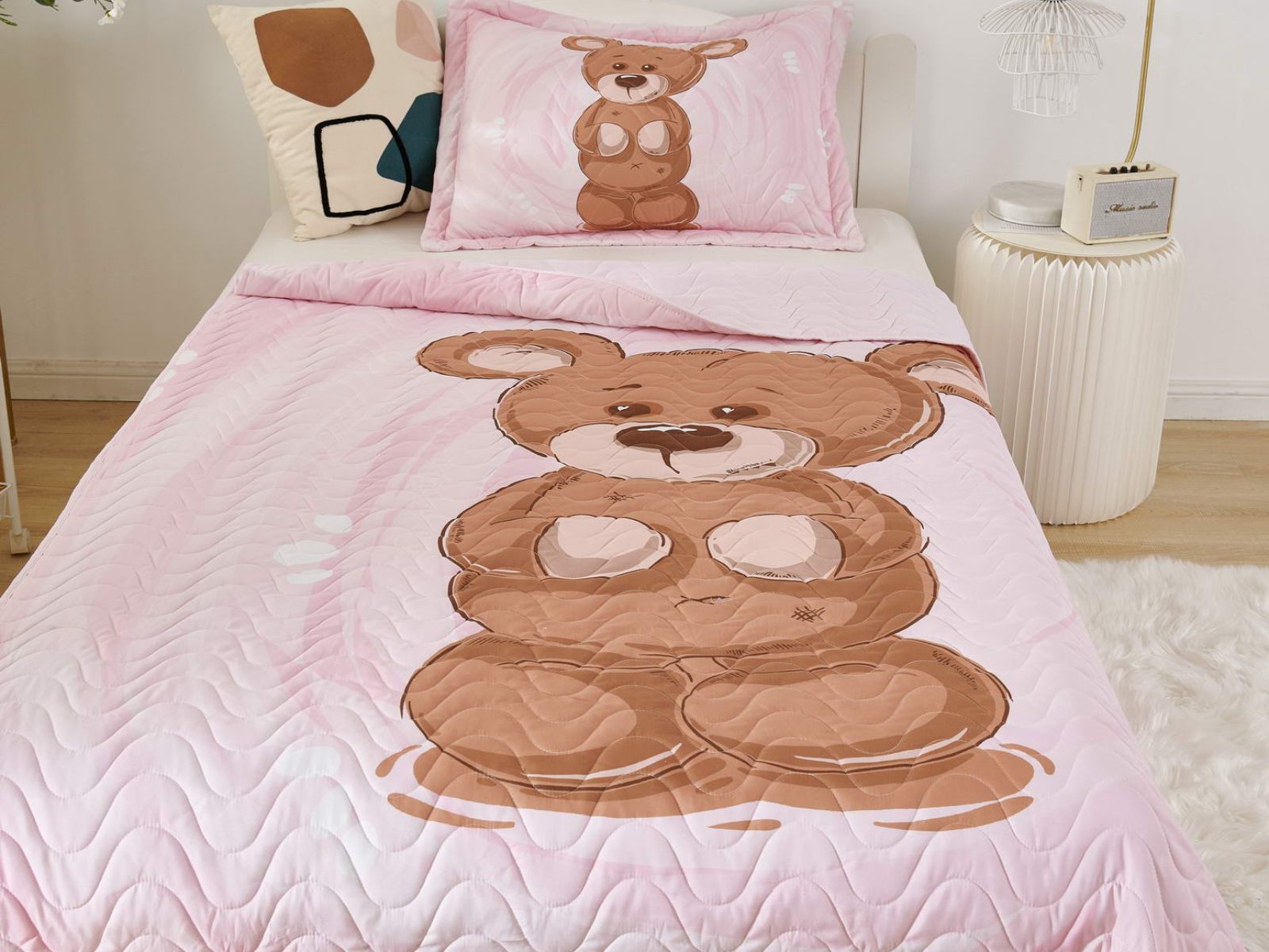 Детские покрывала - это особая забота об уюте и комфорте ребенка. Красивое, стеганое покрывало коллекции «Sunny day» придаст любой детской спальне яркую индивидуальность. Волнистые стежки делают изящные покрывала еще более выразительными и изящными. К ним в комплекте идут наволочки, у них есть интересная особенность, которая непременно понравится ребенку– небольшие ушки.